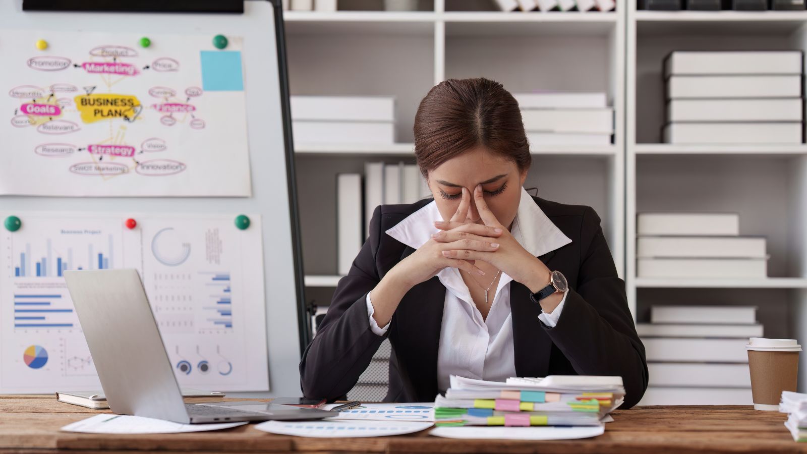Image of a businesswoman feeling stressed out at her desk - Stress Awareness Month 2024